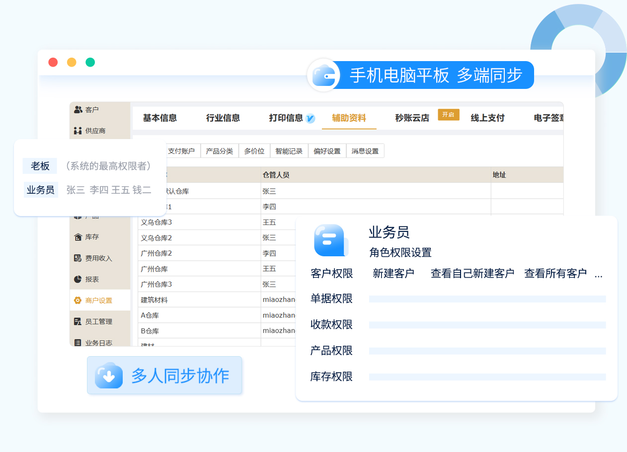秒账系统支持创建多员工账号,手机电脑平板多设备同时同步使用,业务协同更高效。