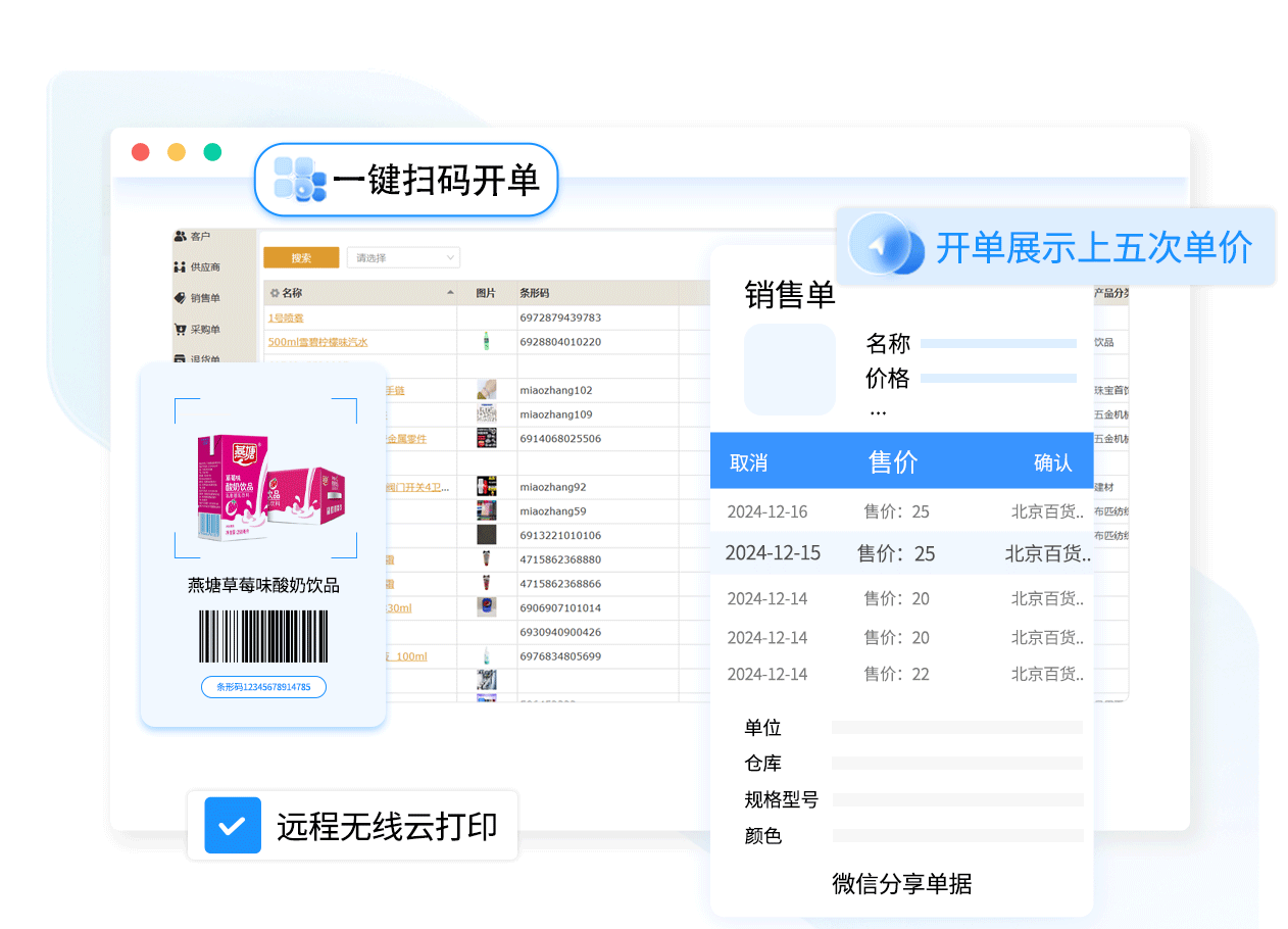 开单展示上五次单价、客户近期交易记录、开单默认客户,不怕记不住不同客户不同价格。