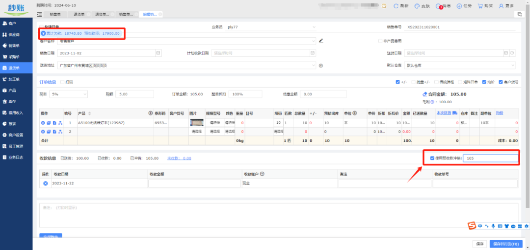 当然,用户也可以点击销售单模块,直接找到需要冲销欠款的单据,点击编辑,在收款信息栏右侧勾选【使用预收款冲销】,输入金额后点击保存也能直接冲销掉对应单据的欠款。