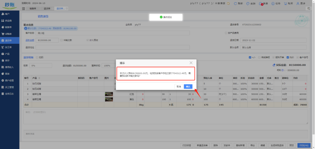 跟直接【冲销欠款】不同的是,点击保存后系统会有一个弹窗提示,说检测到该客户存在欠款,是否要冲销?这时候点击确认,不仅能把客户欠款冲销掉,多余的退货金额还能计入预收。