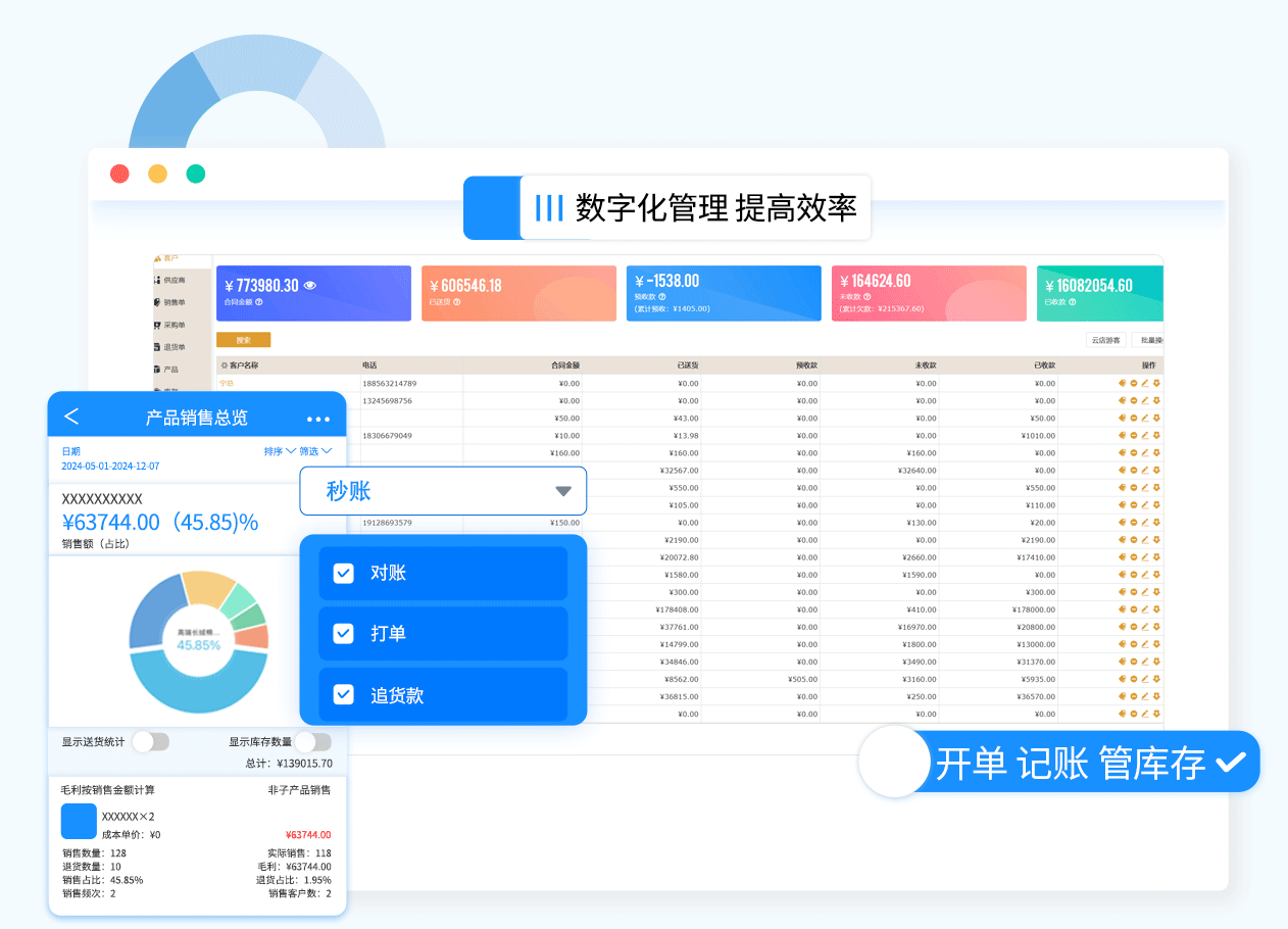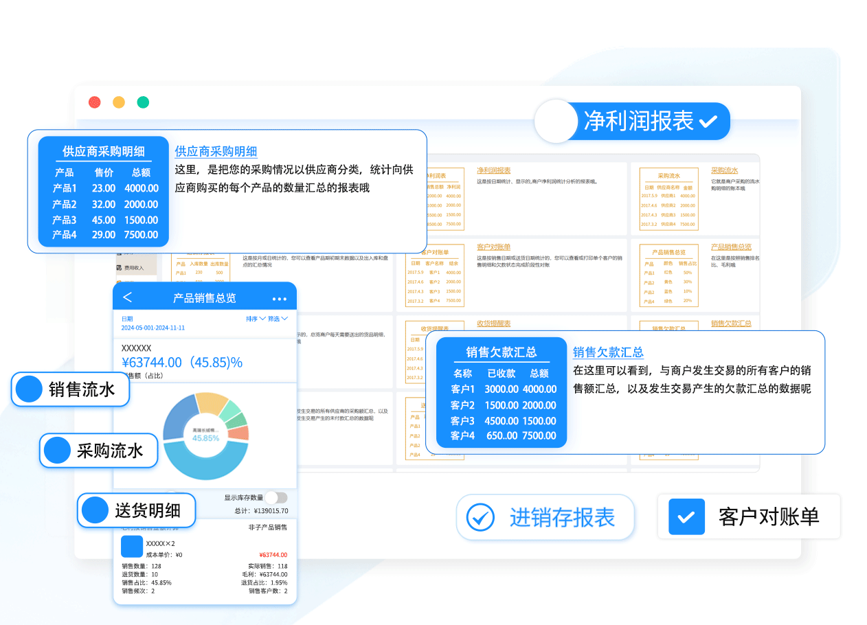 详细记录每一笔钱款走向,自动生成销售、采购、净利润等多种经营报表,赚多赚少一目了然