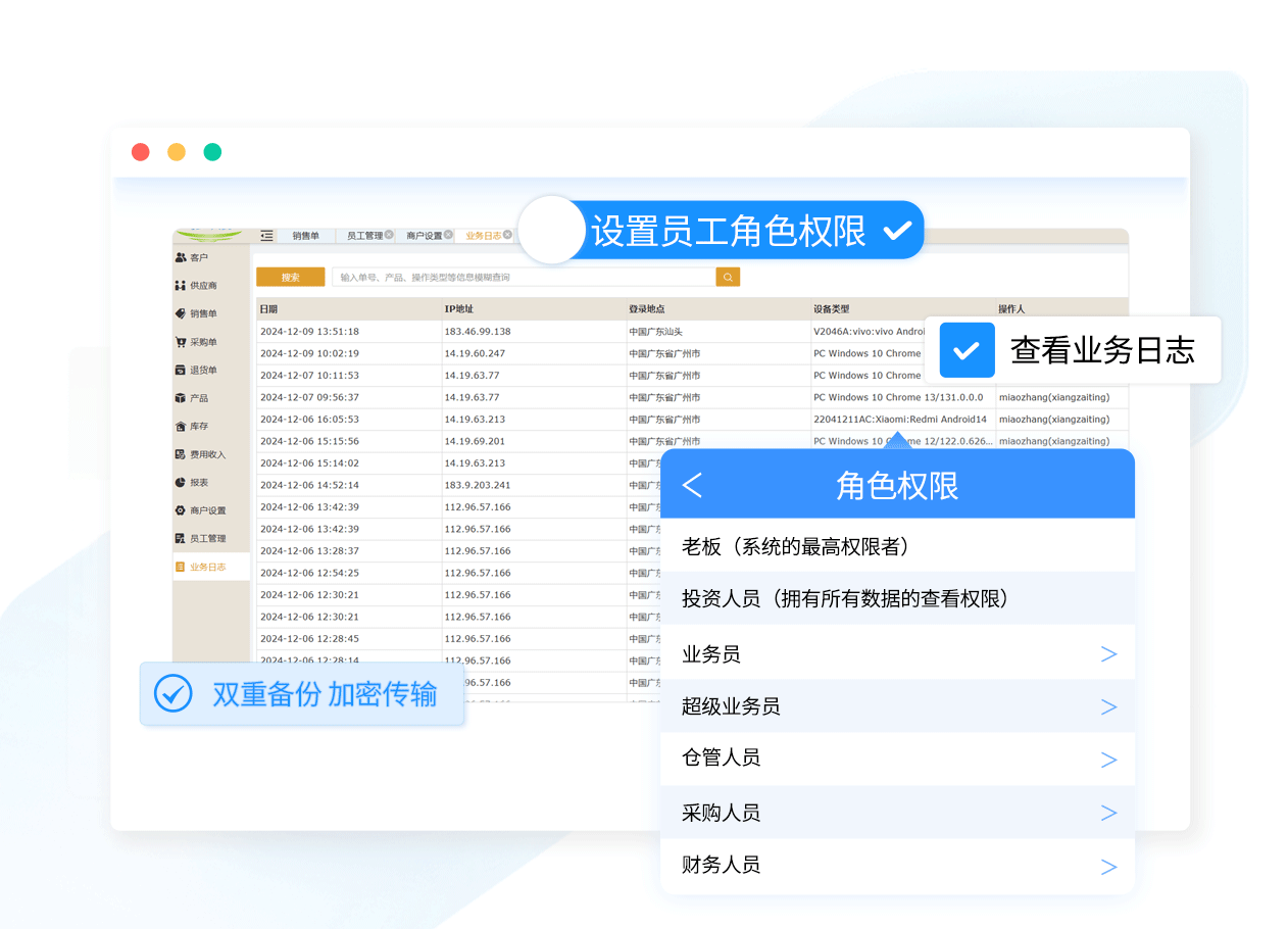 给不同角色的员工开放不同的权限,避免隐私泄露;支持多员工多设备同时使用