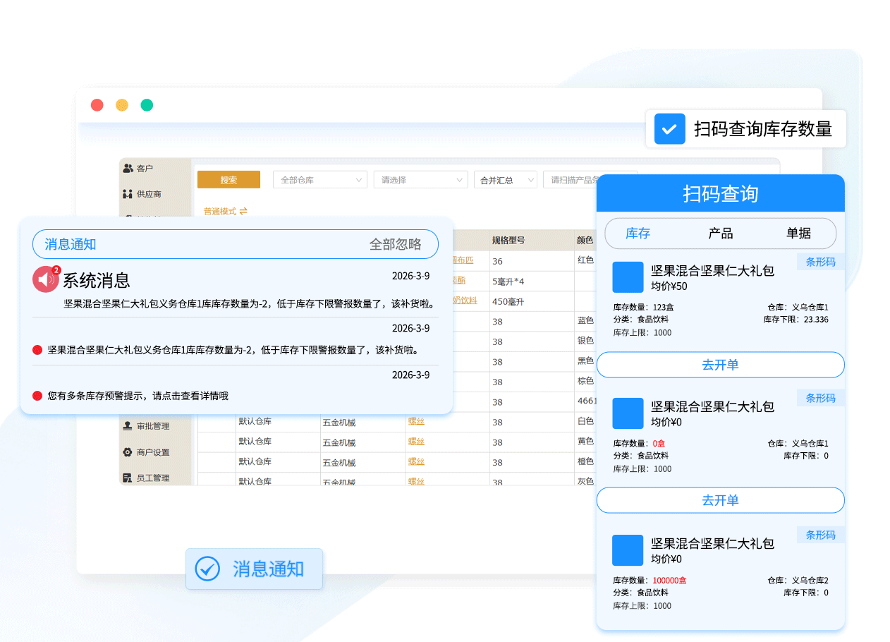 库存预警、收款付款、送货收货都会推送消息提醒,不漏掉生意中的每一个环节
